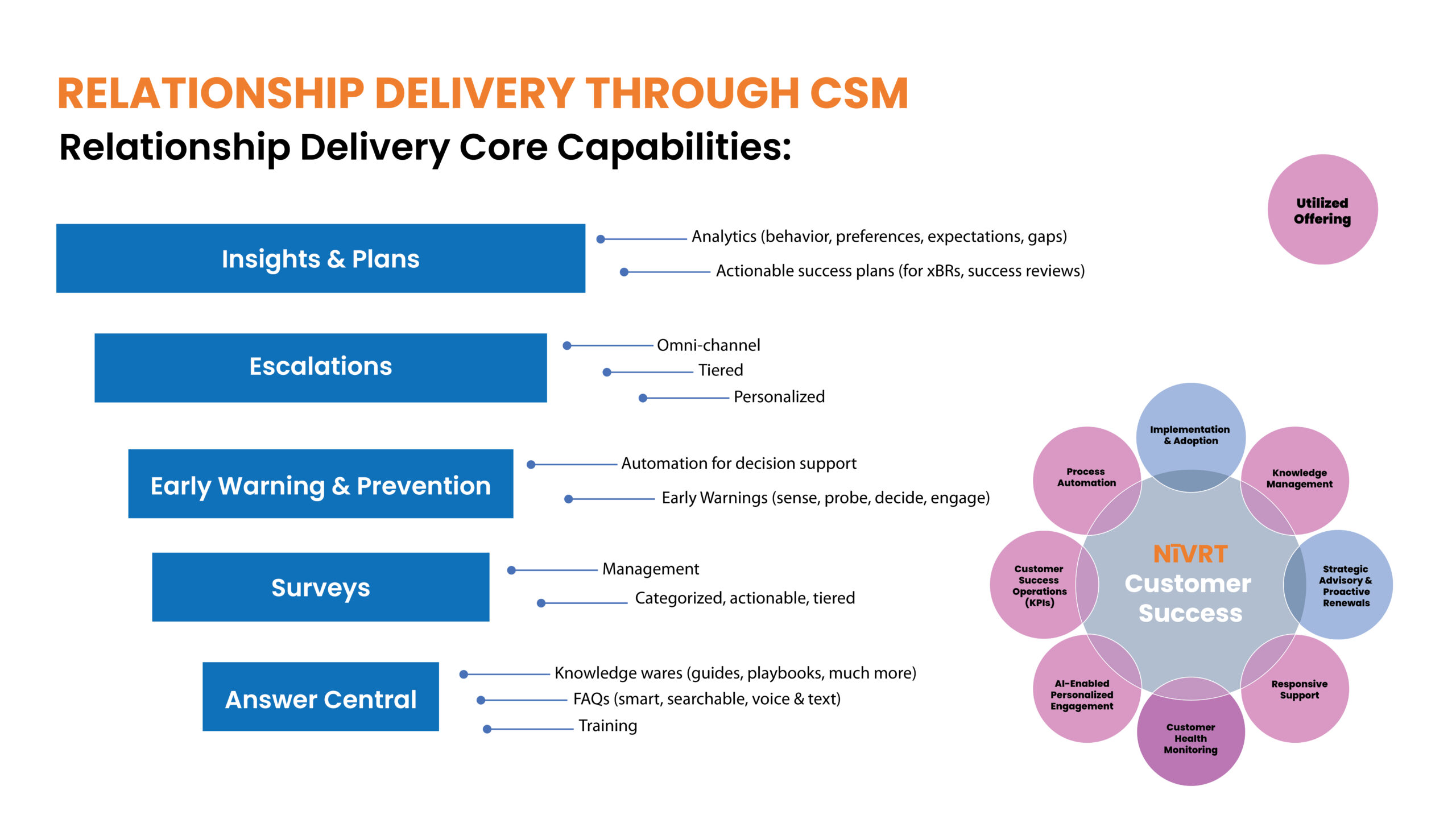NīVRT provides advisory and turnkey-outsourced capabilities leveraging “Automated Customer Success Workbench”, AI based “Know Your Business” (KYB™) to map your products to its usage by your buyers and subscribers, “Early Warning Systems” across key indicators of success, “Answer Central” to help speed-to-support and speed-to-market across multiple customer segments. Thereby helping you build trustworthy, scalable relationships with your buyers and subscribers. These capabilities will differentiate to bring forward meaningful, scalable value propositions to give you the competitive advantage and increased revenue.